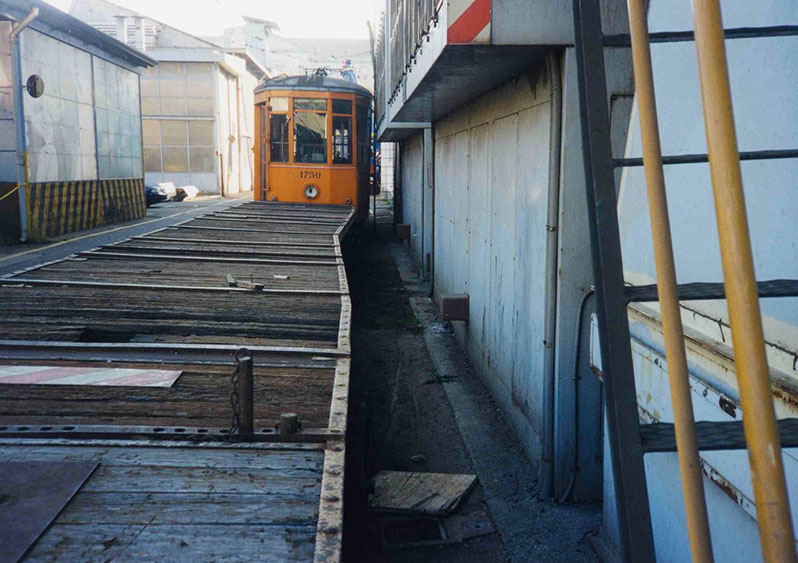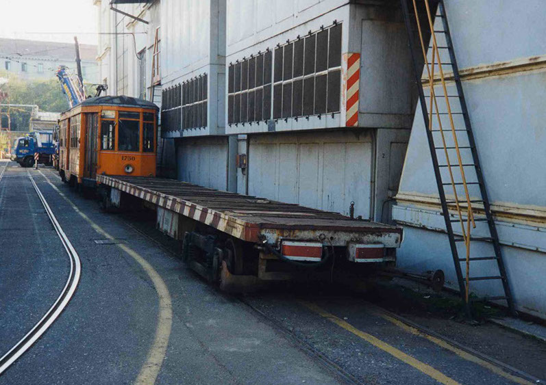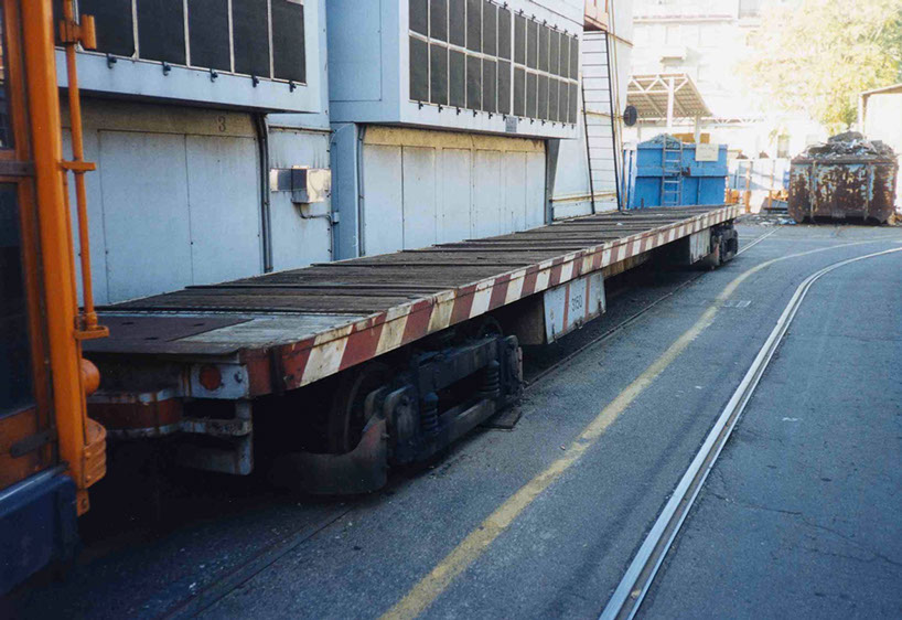 Milan, Italy flat car. Note: the side angles in for to allow for navigating tight corners.