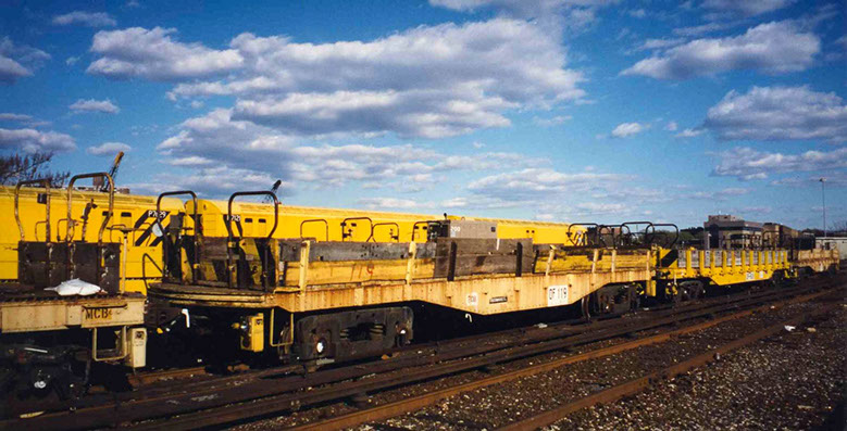 New York City Transit Authority flat car. Note: has handrails for employees to hang onto.