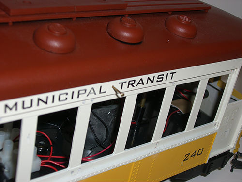 Photo 8: (above) Note 1st and 4th window opened. Metal window guards could be added, plus route sign boxes should be added too. See photo # 3 of LARy car. The window guards could be made of brass rod, soldered to some thin strips of brass, being sure to line the strips up with the window posts.