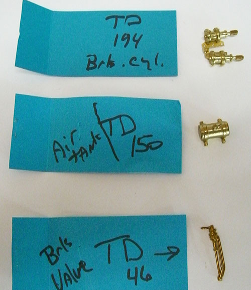 Photo 16: (above) Valley Brass and Bronze “Trackside Details” from Pinedale, CA. TD 194-Brake Cylinder (2 per pack), TD 150 - Air tank, TD 46 – Brake Valve
