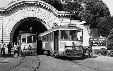 Market Street Railway Car on left passing a Municipal Railway Car on the right.
