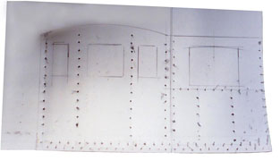 This shows the styrene sheeting after the cab has been outlined and the rivets have been punched in.